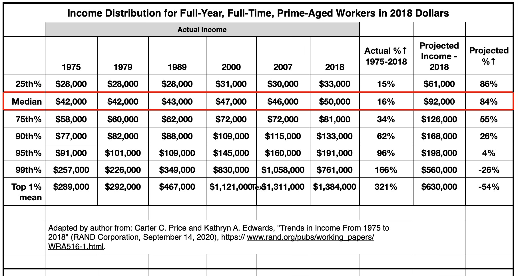 For example, in the second row (highlighted red), look at the people in the median, 50th percentile of the population (roughly the middle class). They started in 1975, earning $42,000 per year. By 2018, their actual income had grown to $50,000 per year, a 16% increase over 43 years. But, if their income had followed the trend line of growth for the 1948-1975 period, it is projected that they would have earned $92,000 per year in 2018. Their income would have grown by 84%!